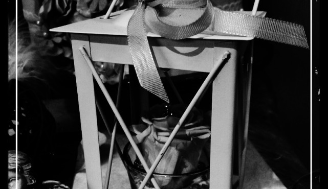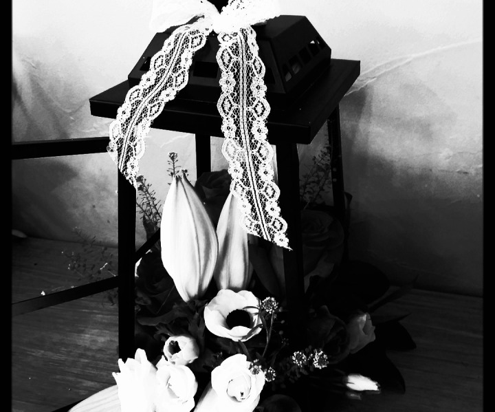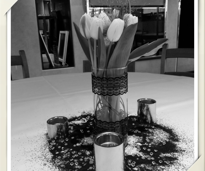 Centre de table avec des tulipes blanches, un vase en verre avec une jolie dentelle noire. Napperon noir. Vases blancs et argentés.