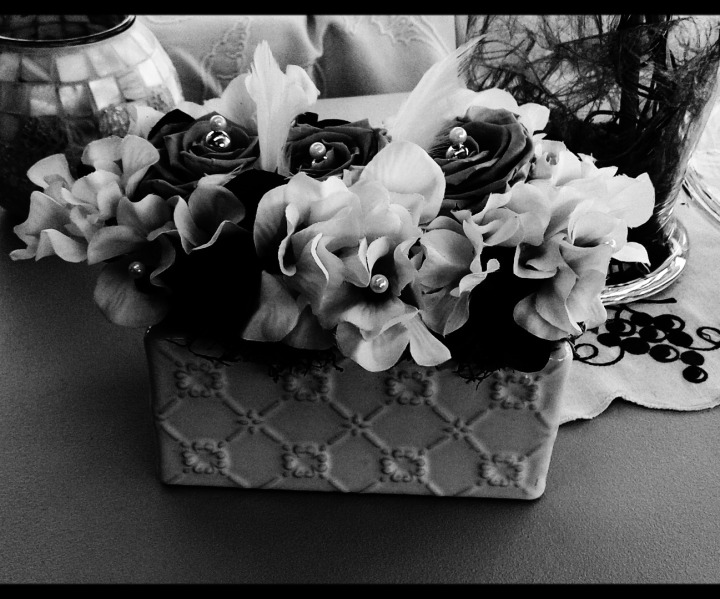 Quelques roses blanches et un joli petit bac en porcelaine blanche.