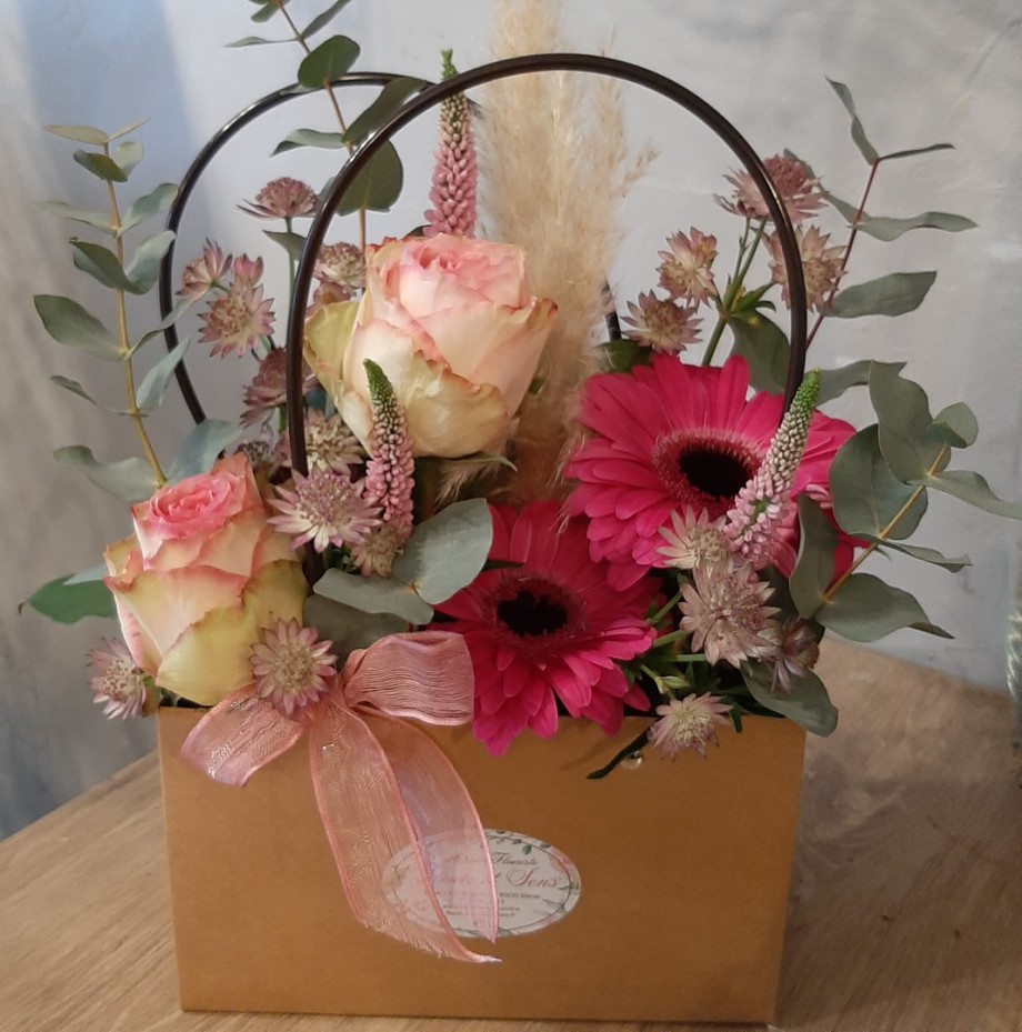 Panier de fleurs coupées rose et fuchsia piquées dans la mousse